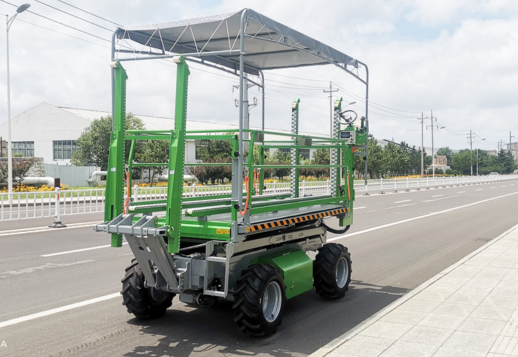 4GP-1200DA diesel full hydraulic drive picking operation platform is a diesel full hydraulic full size four wheel four drive picking operation platform developed by Zoomye Company for medium and large-scale park users. The operating surface is 3m x 3m, which can accommodate 6-8 operators+2 500 kg standard fruit baskets at the same time. It is a high-end product of Zoomye 1200 series platform. It has excellent off-road ability, strong power performance, excellent operation comfort, high efficiency, high reliability High life, high fuel economy, easy maintenance and other characteristics.
