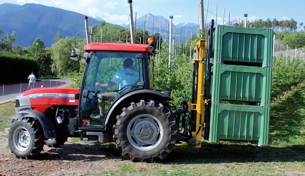 背負(fù)式叉車 是 為解決果園山地越野工況下 轉(zhuǎn)運(yùn)果筐和其它果園物資而研發(fā)的與果園拖拉機(jī)配合使用的果園轉(zhuǎn)運(yùn)裝備。叉車安裝在拖拉機(jī)后三點(diǎn)懸掛上,駕駛員通過操作液壓控制閥來控制叉車動(dòng)作,叉車具有舉升、側(cè)移、傾斜、鎖筐等功能,配備了舉升油缸2根、傾斜油缸1根、側(cè)移油缸1根、鎖緊油缸2根共計(jì)6根。可一次舉升多個(gè)果箱,方便果園果箱等物資的搬運(yùn),節(jié)省人力物力。果園用戶無需單獨(dú)購買山地叉車,把該背負(fù)式叉車直接安裝到拖拉機(jī)上即可實(shí)現(xiàn)山地搬運(yùn)作業(yè),拖拉機(jī)可到之處都可以使用。特別適合果園采摘后的果箱的轉(zhuǎn)運(yùn)工作。